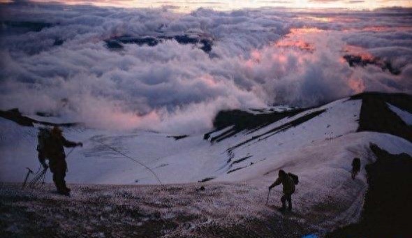 如图,登山者正在跨越俄勒冈州最危险的火山胡德火山。斯科特说:“胡德山最令人关注的是,胡德山两侧有居民居住,还有州际高速公路。”在最后一个冰川世纪,胡德山非常活跃,而在过去1500年中,胡德山发生过两次大规模喷发。