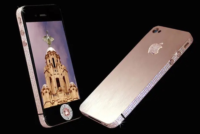 iPhone 4S Elite Gold是由英国知名设计师斯图亚特·休斯设计的,24K纯金的机身搭配由一颗2.6克拉主钻和一圈较小的钻石组成的Home键,整体机身共有500颗白钻,手机背部的标志就镶嵌了53颗钻石,十分奢华。除此之外,包装盒由铂金、霸王龙骨骼化石和稀有宝石构成,极具价值。