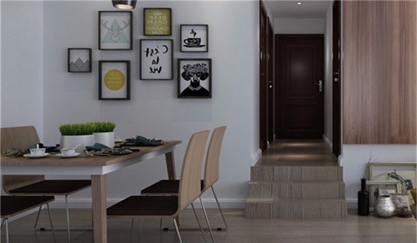 1、这款小户型简单装修图,对餐厅的设计采用了深木色的餐桌椅搭配上圆形灯饰,使得整个空间的层次感错落有序。墙面的木柜和地板纹理完美结合在一起,不失富丽堂皇的感觉。