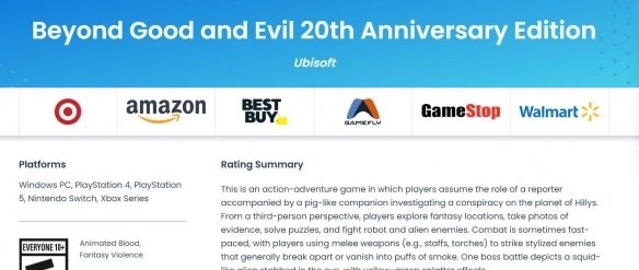 美国分级网站ESRB最近上架了《超越善恶20周年纪念版》的页面,上面显示该游戏被评为“E 10+”级别,将会登陆PC, PlayStation 4, PlayStation 5, Switch, Xbox Series平台。从页面上看不出这是完全重制版还是简单复刻版,并且也没有发售日相关信息。【周边网】考虑到它叫做“20周年”版本,应该不用等太久。