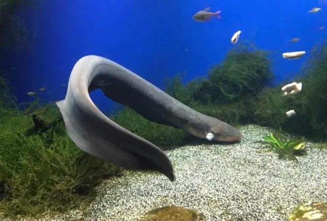 电鳗也是世界十大最奇葩的观赏鱼之一,它们能够释放极强的电流,足以将人击昏,有着“水中高压线”之称,经常在水族馆中作为观赏鱼。
