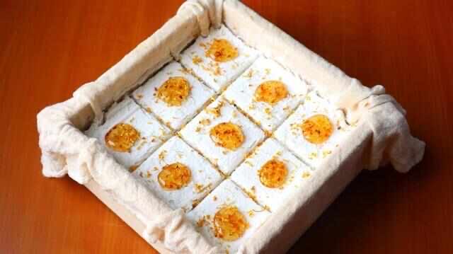 桂花糕是安徽徽州的传统小吃,历史悠久,深受人们喜爱。[bai]徽菜桂花糕选用优质糯米粉、糖、等原料,加入适量的桂花和调料,经过蒸制、冷却等工艺,制作出软糯、甜美的糕点。其外观呈椭圆形,口感丰富,是徽菜中的一道美食。