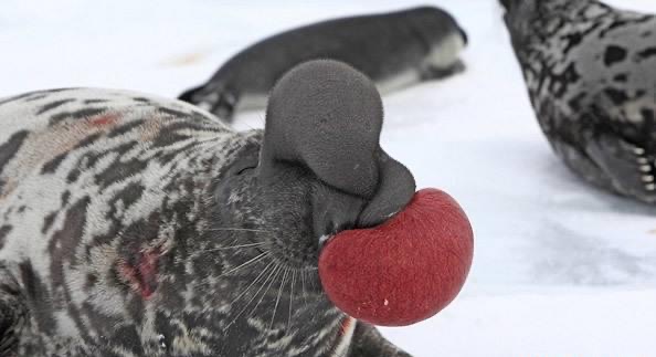 一种脆弱的物种,它们的鼻腔能够扩大到足球的两倍大。通常在挪威、冰岛和格陵兰岛沿岸的浮冰漂流,虽然每年一度的加拿大、俄罗斯和挪威捕猎活动会影响种群数量,但更有可能的是,减少的鱼类资源也对它们的数量产生不利影响。