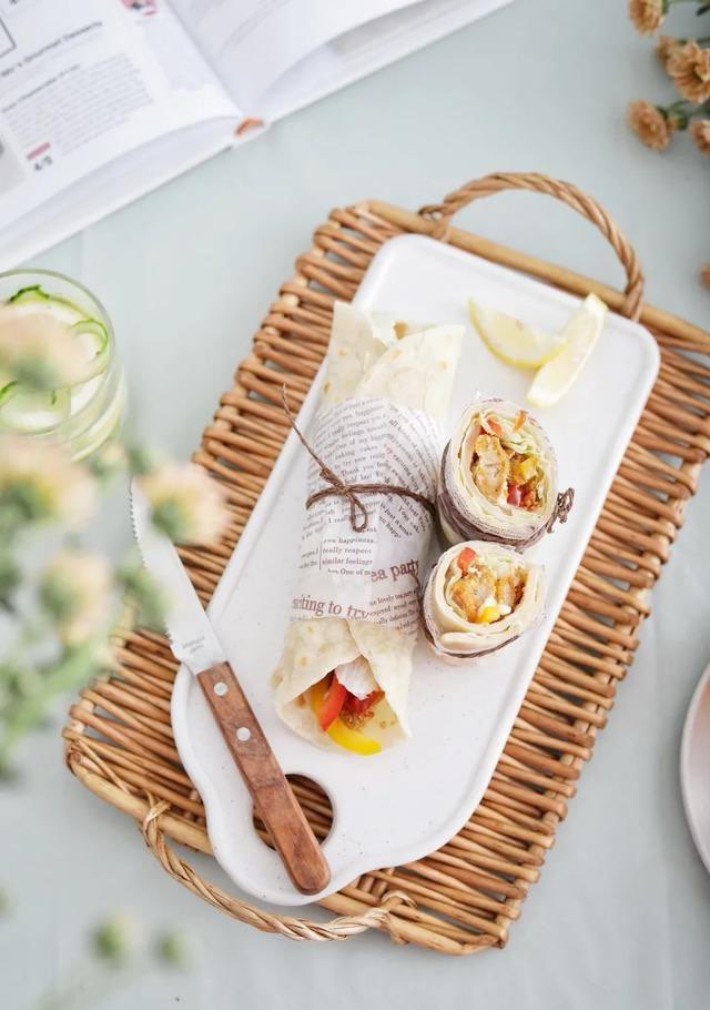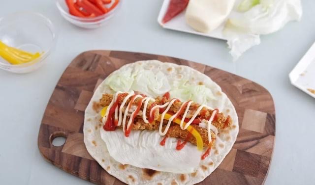 酥热的炸鸡、脆爽的生菜、酸甜的番茄,还有蛋黄酱和莎莎酱混合起来的酸辣味道。包在卷饼皮里,咬下时酱汁会从饼皮边缘溢出来,多种味道混合,吃肉的快意尽情满足。