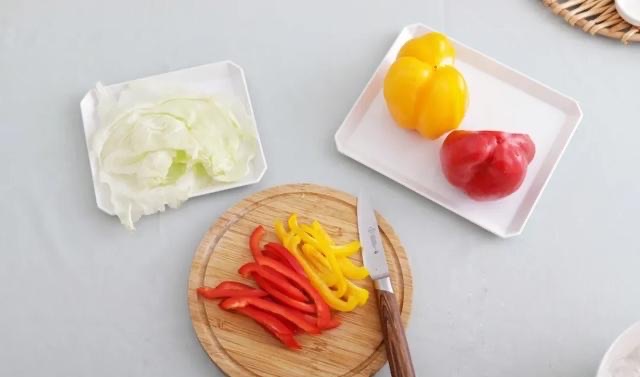 面团在松弛,我们来处理配菜,彩椒,奶油生菜冲洗干净,彩椒切丝。