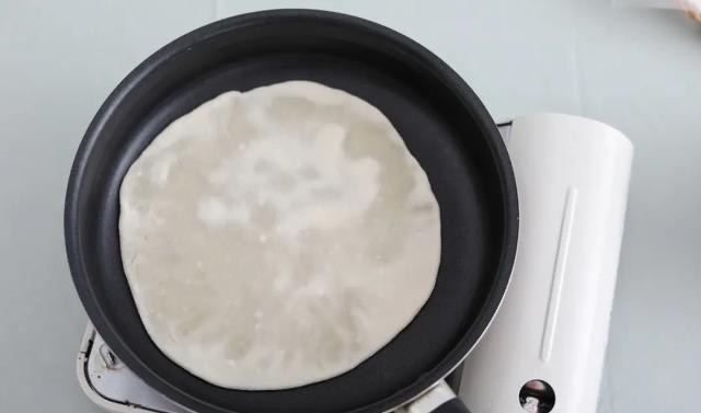 平底锅烧热小火,不用放油,放入饼皮,变色后翻面。