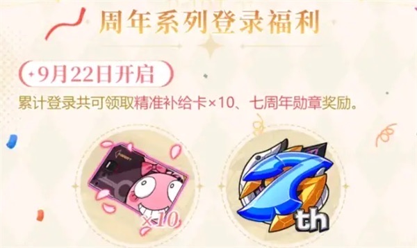 1、期间登录游戏领取精准补给卡和七周年勋章奖励。【周边网】