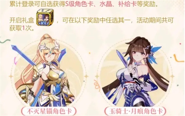 2、累计天数可获得S级角色卡、水晶和补给卡,角色卡包括不灭星锚和玉骑士月痕。