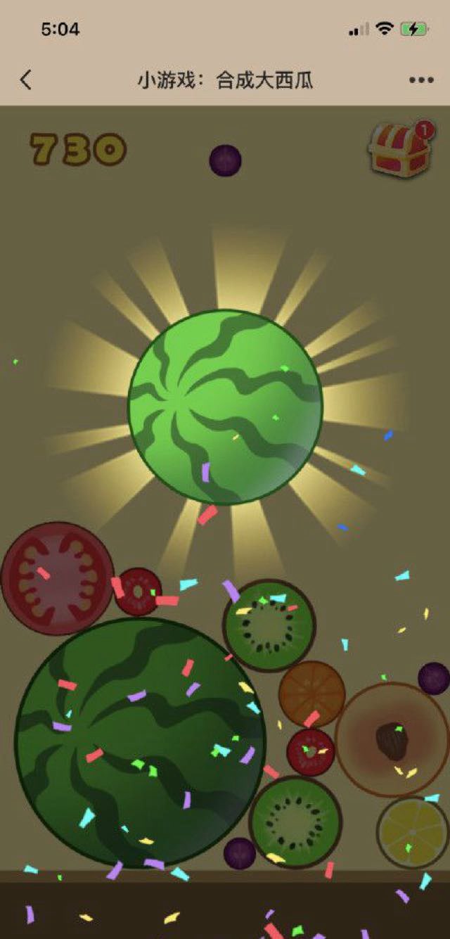 一顿操作之后,大致摸清了这款游戏的套路,玩法类似笔者4年之前沉迷过的2048。相同的水果可以合成一个比之前更大的水果,最终合成一个西瓜,等等,你以为就这么结束了?这游戏精明之处就在这,它没有上限,西瓜越多越好,西瓜也多,最终评分也会越高,这个套路就跟2048一样。
