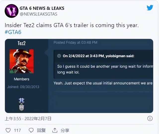 据Sportskeeda报道,GTA泄密者Tez2似乎相信我们可能会在2022年得到GTA 6的游戏预告片。你可以查看下面的推文。