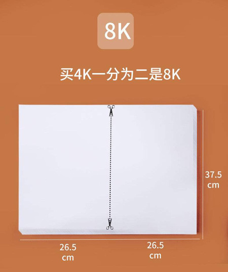 8K纸大于A4纸。8K表示将一张纸切成8张,8K纸的尺寸为420mm * 285mm。A4纸的尺寸为210mm * 297mm,因此一张8K纸相当于2张A4纸。现有的大多数家用造纸和印刷机械都用于生产和应用787mm * 1092mm尺寸的纸张。