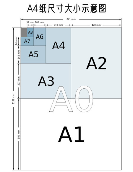 A4纸就是A系列中最常用到的一个尺寸。其中A0的尺寸841×1189mm,A4的尺寸就是把A0的纸对折4次后得到的尺寸。A系列的纸长宽比是符合美学上的黄金分割比例1:1.414的,且A0的纸面积是1平米。