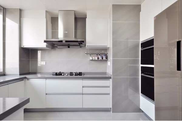 橱柜可以选用厨房瓷砖的颜色作为主色调,搭配白色、灰色,显示出层次。