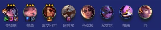 阵容组成为:卡特琳娜、瑟提、派克、阿兹尔、泰达米尔、蔚、嘉文四世、奈德丽、盖伦,这个阵容大成基本没有对手。