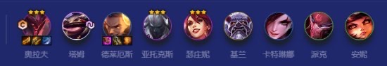 阵容组成为:奥拉夫、塔姆、德莱厄斯、亚托克斯、瑟庄妮、基兰、卡特琳娜、派克、安妮。如果有法转的话可以玩龙魂法转奥拉夫,装备可以做疾射火炮,汲取剑,换上布兰德,索尔。