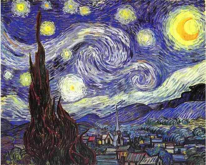 《星月夜》是最广为人知的梵高的十大名画之一,很多人看见这幅画都觉得很佩服。这幅画给人一种又安静又热闹的的感觉,画作整体色调偏冷色调,大面积的蓝色。添加上快乐的橙色,用这样偏冷偏暗沉的颜色,打造出一个宁静又和谐的夜晚,大师不愧是大师。