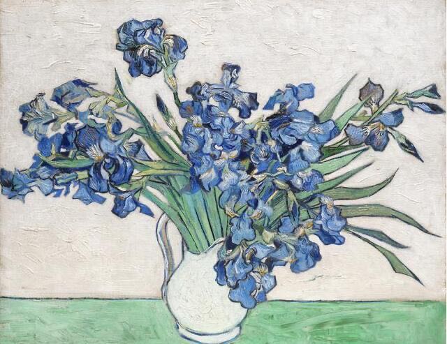 《鸢尾花》也是梵高十大名画之一,画中描绘的是鸢尾花,看起来非常漂亮。这幅画背景是浓烈的黄色,其余颜色是和谐的蓝色和绿色,中和了黄色给人带来的狂热的感觉,没有了《向日葵》那种张力,让人感觉很舒服。