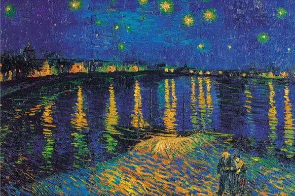 《罗纳河上的星空》创作于1888年,是在法国南部城市阿尔的罗纳河画的。蓝色的星空上点缀着点点星光,与倒映在罗纳河上的灯光相映成趣,一切都是生机勃勃的,可以看出当时梵高的心情是非常愉快的。