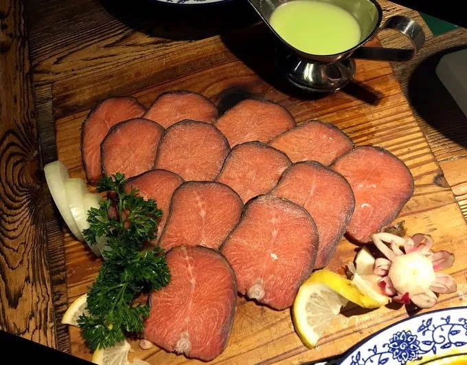 熏五香大马哈鱼,这个我尝过,咸香适度,当下饭菜最合适不过了。[bai]熏五香大马哈鱼,产自乌苏里江,肉质细嫩、味道鲜美。制作这道菜,首先要将大马哈鱼去骨,切成均匀的片状,然后用盐、酱油、味精、醋、姜、蒜、葱等调料进行腌制。腌制完成后,将鱼片蒸熟,再用糖进行熏制,最后抹上一层香油,使其色泽更加红润,味道更加鲜美。这道菜的特别之处在于它的熏制过程,这不仅让鱼肉带有独特的烟熏香气,还保留了大马哈鱼的原始风味。熏制后的鱼肉色泽诱人,口感丰富,是哈尔滨地区俄罗斯餐馆中的常见美食,而且价格亲民。