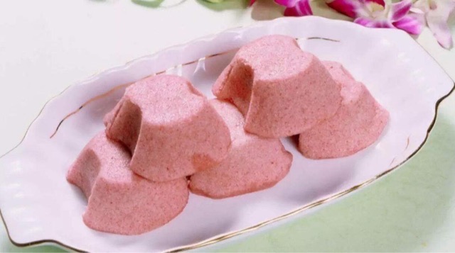 定胜糕是江苏苏州的传统名点之一,起源于南宋时期,是以糯米、粳米、白糖和红曲等主要原料制作的,外观色泽淡红,口感松软,还带有甜甜的豆沙味。