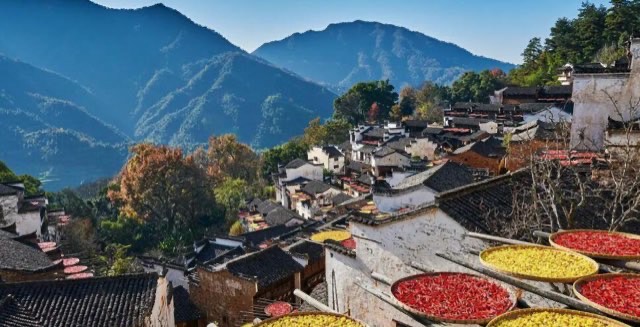 每年9月,婺源到了秋收季就会出现一幅由辣椒组成的丰收盛况。这时候,每家每户都会将自家的辣椒等农作物晾晒在一个个竹编之上。红色的辣椒、橙黄色的孔雀草、黄色的菊花,配合袅袅炊烟和山腰薄雾,简直美不胜收。