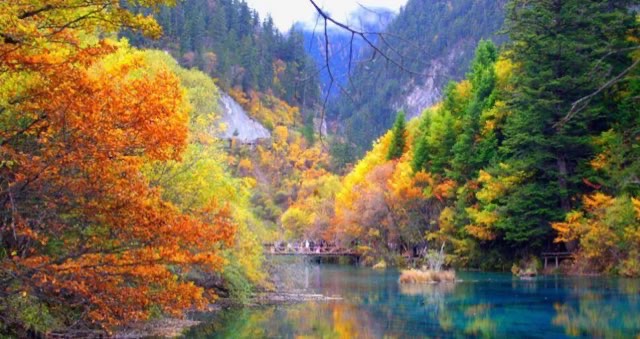 秋天,大自然为九寨沟抹上了非常浓厚的色彩。漫山遍野的金色、红色倒映在晶莹剔透的水中,给游客带来极其强烈的视觉冲击。