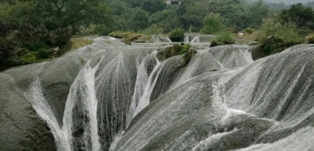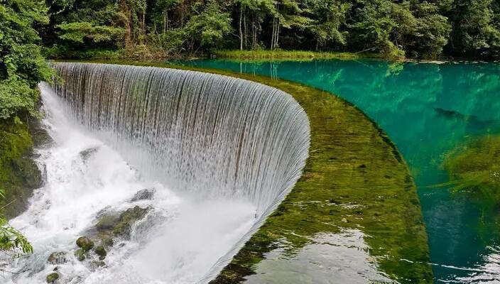 “古老寺庙与巍峨大厦共存”的陡坡塘瀑布是黄果树风景名胜区庞大瀑布“家族”的重要组成部分,位于黄果树大瀑布上游1公里处,在瀑布群中是瀑顶最宽的。据称,当洪峰来临时,在观景台上会听到“轰隆轰隆”的吼声,景象波澜壮观,所以又叫“吼瀑”。站在观景台中,能听到水声震耳欲聋,似疆场上万马奔腾;瀑布平铺横向展开,气势宏伟雄壮,水雾扬起随风飘落,让人平生一股豪气。