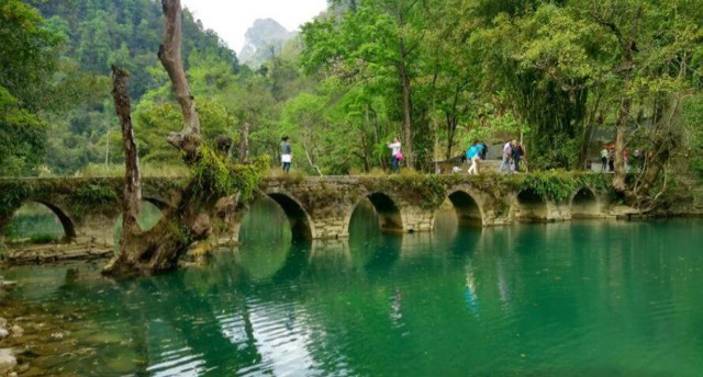 有“超级盆景”的美誉。桥由麻石条砌成,桥身爬满藤蔓和蕨类;古色古香的桥下是绿得令人心醉的涵碧潭。两岸古木参天,巨大的虬枝沿着桥伸臂,宛如巨伞撑在桥上,给人一种幽深的观感。