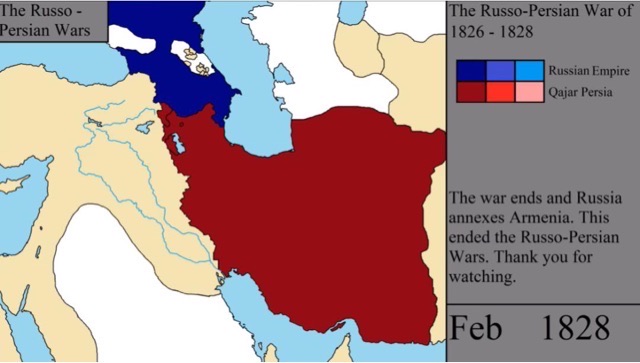 为了夺取高加索地区和里海,沙俄和波斯爆发了“俄波战争”。实力孱弱的波斯帝国无力抗争,与沙俄签订《古利斯坦条约》(1813)和《土克曼恰伊条约》(1825),被迫将东亚美尼亚地区和北阿塞拜疆地区(今阿塞拜疆的国家雏形)割让给沙俄。