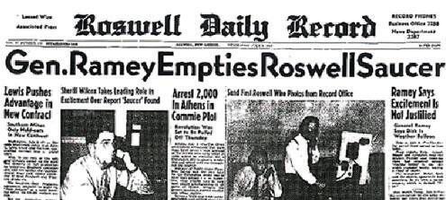 据说1947年的飞碟坠毁事件是在罗斯维尔镇子下了一夜的暴雨的第二天早上,被农场主人布莱索所发现的。他出来检查农场内有无羊群受伤,结果发现自家草地上有不少发着光奇怪的块状物体,还有像飞碟一样直径十米的庞然大物砸草丛之中,甚至能看到飞碟驾驶舱内部死在驾驶室的外星人!