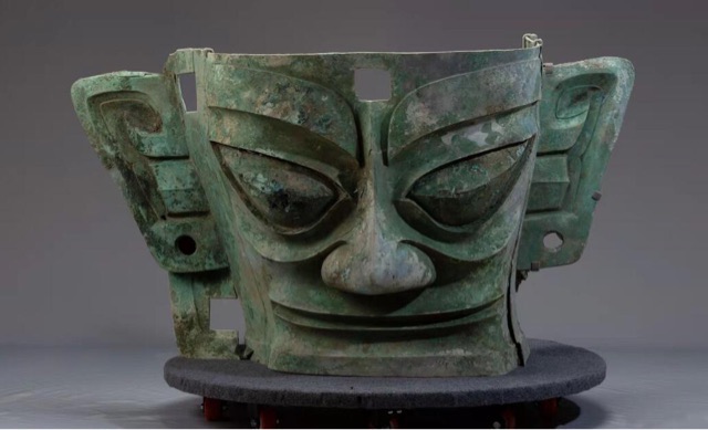三星堆青铜人物雕像群最为明显的雕像便是一种大眼巨头的面具或神像。它以神奇而夸张的艺术手法,表现出超凡脱俗的气质,与写实风格的人像群体有明显的差别,所代表的应是一种神祗。青铜面具硕大而威严,被悬挂、组装在大树、“图腾柱”之类的圆柱形立柱之上,成为当时敬奉的重要神祗之一。三星堆的巨型人面具,是古蜀先民敬仰的神的化身。他们被制作者采纳了极度夸张变形的手法,是为了充分体现神的奇怪和威严。