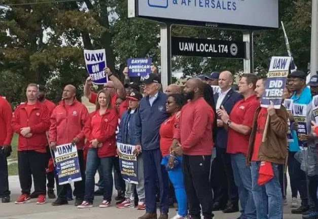 在罢工现场,拜登加入了UAW主席肖恩·费恩的行列,戴上了有UAW标记的黑色鸭舌帽,还与罢工纠察线上的工会工人握手。据报道,拜登此举使他成为美国历史上第一位参加罢工集会的美国总统。