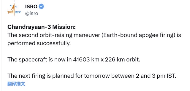 印度月船三号这次真的悬了!印度太空研究组织ISRO宣布:7月17日成功进行了第二次升轨操作,将轨道由第一次升轨完成之后的173km×41762km,提升到了226km×41603km,即使是在印度网友一片欢腾的评论中,也有不少明眼人士表示疑惑:这次升轨最明显的提升是把近地点高度提高了53公里,而远地点高度甚至还下降了159公里,简直是一个谜之操作!