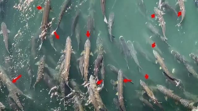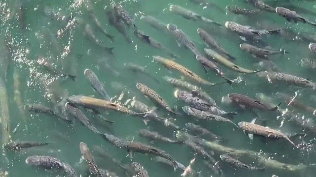 航拍画面里,这些大鳡鱼都看起来体型惊人,部分可能接近两米,体重超过百斤,在水中时隐时现——画面里尖头的是鳡鱼,圆头的鱼是鲢鳙,可以看到数量几乎相当。【周边网】