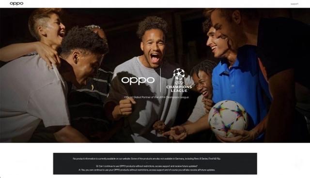 5 月 15 日消息,由于诺基亚提起专利诉讼,自去年以来 OPPO 在德国的手机销售就已经暂停,现在该公司在德国的官方网站也空空如也,没有任何产品的展示。网站首页只有一个广告,宣传 OPPO 与欧洲冠军联赛的持续合作,以及一个常见问题的横幅,只涉及到对现有 OPPO 设备的支持。