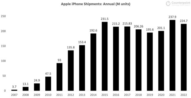 2007年1月,被乔布斯称为“苹果将彻底改变手机”的第一代iPhone正式发布,并于当年6月底上市销售。到2018财年末苹果最后一次在财报中公布产品销量,iPhone十二年累计销售14.68亿部,在过去11个财年持续贡献了超50%的营收。另据Counterpoint数据,2007-2022年,iPhone累计销量达到23.92亿部,市场份额也由最初的3%升至18%,全球排名第二。