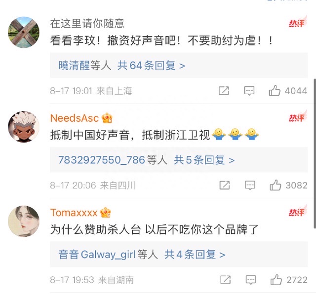 除了品牌官微评论区沦陷,《好声音》节目组的评论区也没能逃过网友责难。