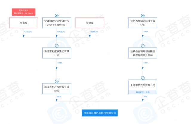 显而易见,吉利在双方合作的新品牌极越中占据“主导”位置,从股权结构也能说明这一点,企查查显示,8月9日,吉利和百度合资注册了杭州极与越汽车科技有限公司(以下简称“极越汽车”),注册资本1000万人民币,双方分别持股65%和35%,吉利是控股股东。