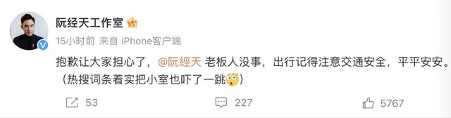 当天,阮经天工作室发微博报平安,并称被热搜吓了一跳。阮经天本人则未在微博表态。【周边网】