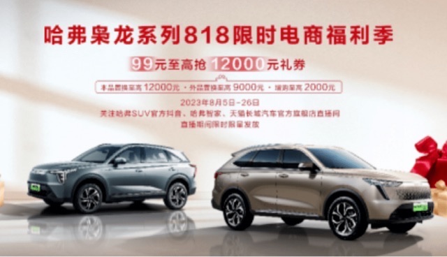 长城旗下新能源品牌哈弗枭龙系列推出“818限时电商福利季”活动,用户下订可享2000元抵8000元现金膨胀礼,在8月5日至8月26日期间可以99元秒杀至高1.2万元礼券。