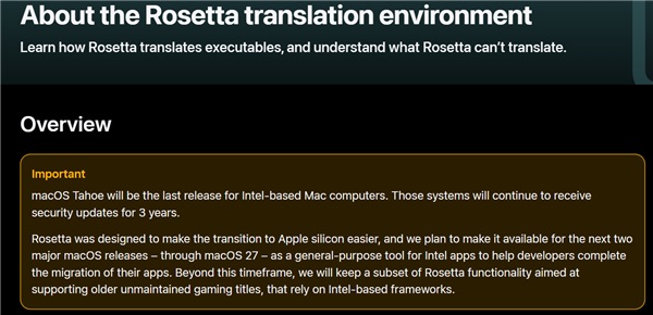 macOS 27以及之后的macOS 28系统中,Rosetta 2仍然继续保留,之后进保留该功能的一个子集,以支持必须依赖Intel框架、不再维护的老游戏。