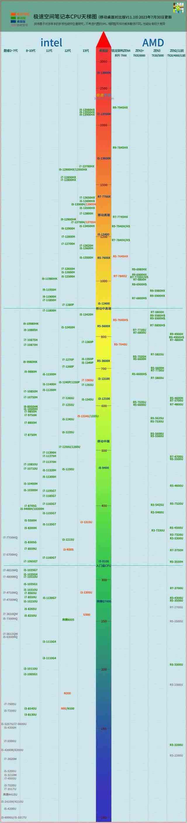 天梯图将CPU性能按高低排列,上面的性能高,下面的性能低;像梯子一样排列起来,因为科技永远在进步,所以这个梯子上不封顶,叫天梯图