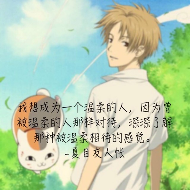 2、 "我想成为一个温柔的人,因为曾经被温柔的人那样对待,深深了解那种被温柔相待的感觉。"——夏目贵志 —— 夏目贵志《夏目友人帐》