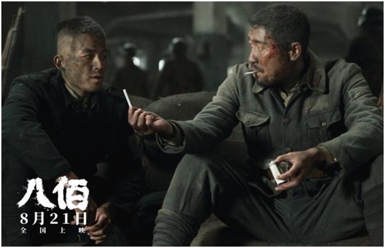 电影讲述的是1937年淞沪会战末期的四行仓库保卫战,400余人对外号称800人,固守苏州河畔的四行仓库、阻击日军的故事,这种坚守当然会付出高昂的代价,《八佰》用心刻画了这些战士经历的痛苦和挣扎:比如端午一开始胆小不敢开枪杀敌,老铁在敌军冲进来之后吓得躲进麻袋堆里,像羊拐这样的“老兵油子”则是一副冷漠麻木的态度……