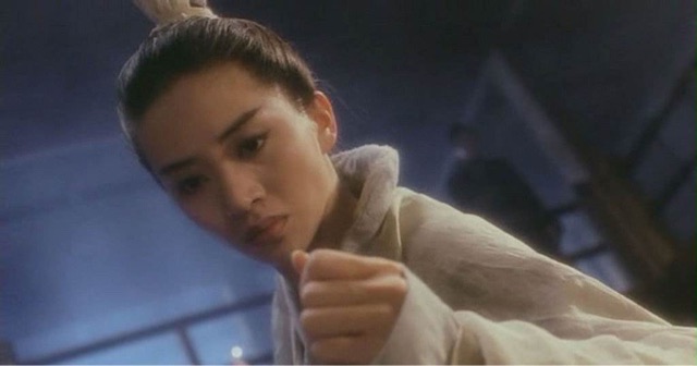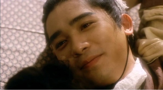 梅艳芳太帅气了。每一个动作都这么潇洒,有风骨,真的是有魏晋南北朝的意思。但是配音又很单纯,声音柔和,和她这个人物性格很符合。单纯,白纸一张。她最开始出场的时候是一身白衣,然后喝水,那个红唇啊!最后决斗那一场,穿一身黑,帅气得简直是要我的命了。