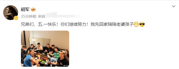 5月1日,胡军在个人社交账号晒出电影《长空之王》主创聚餐合照,表示“兄弟们,五.一快乐!你们继续努力!我先回家陪陪老婆孩子”,照片中《长空之王》的主创王一博、于适、卜钰、翟宇佳、王子宸、芦鑫全员到齐,围坐在茶几旁一起聚餐。