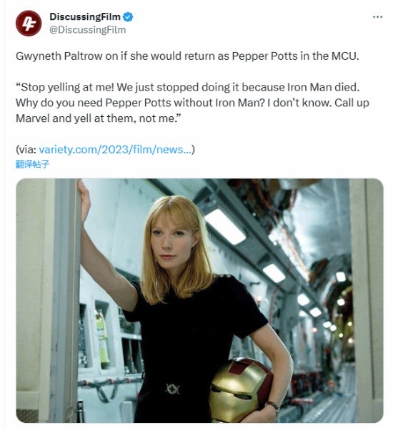Gwyneth Paltrow回应粉丝:“请不要再问我为什么不再和漫威合作了,已经结束了,钢铁侠已经死了,我不明白钢铁侠都不在了你们为什么还需要小辣椒呢?这个事情打电话去找漫威啊。”