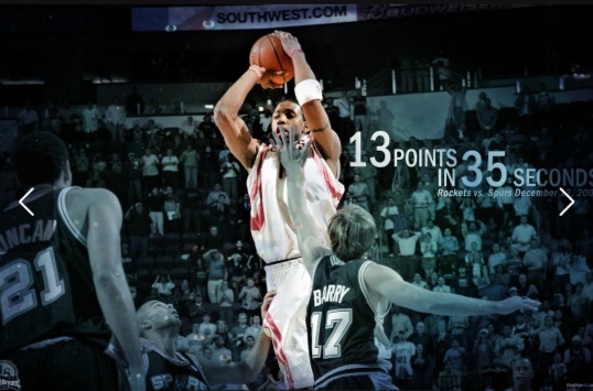 2004年12月9日,休斯敦火箭队在主场丰田中心迎战圣安东尼奥马刺队,在比赛还剩不到36秒的时候,火箭队还以68:76落后8分。在马刺队罚球全中的情况下,火箭队的最后拼搏看似已然无望,但麦迪在接下来的时间内上演了我们从未见过的个人表演:他连续投进了4个三分球,包括一次成功的“3+1”,在35秒之内独得13分,凭一己之力帮助火箭队以81:80翻盘获胜,书写篮球历史上最值得纪念的逆袭史诗。