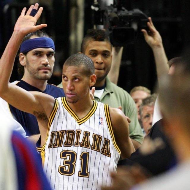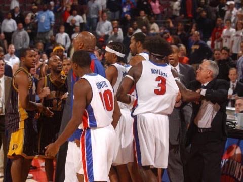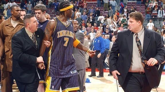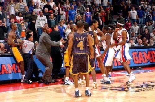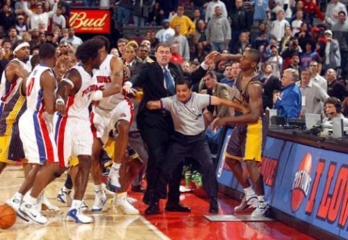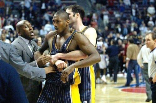 由于双方在场上都太过强硬,比赛的火药味也越来越浓,甚至连裁判的吹罚尺度也开始飘忽不定,于是,在比赛的最后45秒里,一场NBA史上最大规模的斗殴事件开始爆发。
