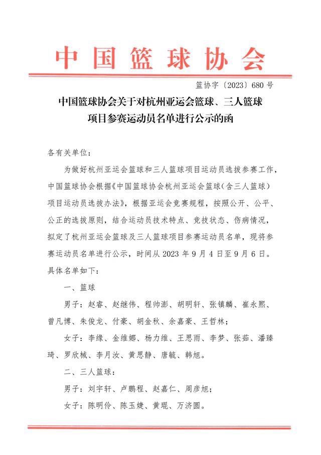 9月4日讯 今日中国篮协公布了杭州亚运会篮球、三人篮球项日参赛运动员名单。五人男篮名单如下: